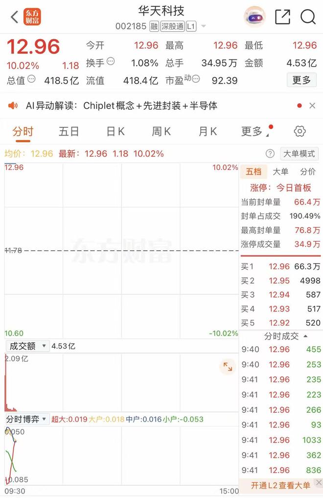 10月17日,披露重组预案后的华天科技(002185),于当日开市起复牌。华天科技复牌后,开盘即一字涨停,现报12.96元/股,总市值418.50亿元。