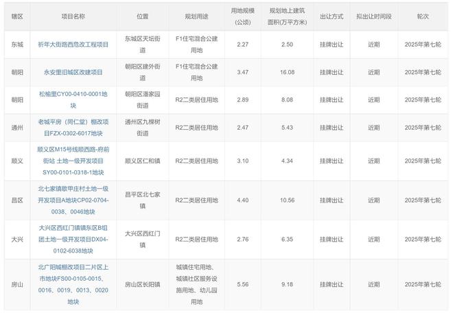 9月3日,北京市规划和自然资源委员会官网公布了2025年第七轮拟供应商品住宅用地清单,共涉及8宗地,土地面积共约27公顷,建筑规模总计63万平方米左右,这些地块都将在近期供应。