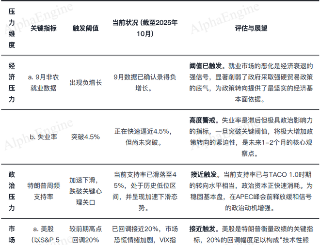 TACO 2.0的主要特征在于政策转向不再由单一因素触发,而是需要经济、政治、市场三大领域的压力同步达标,且调整节奏更为平缓,需要更长时间累积压力。