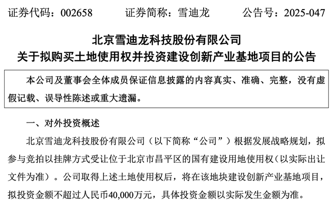 10月19日晚间,雪迪龙(002658)公告,根据发展战略规划,公司拟参与竞拍以挂牌方式受让位于北京市昌平区的国有建设用地使用权(以实际出让文件为准)。