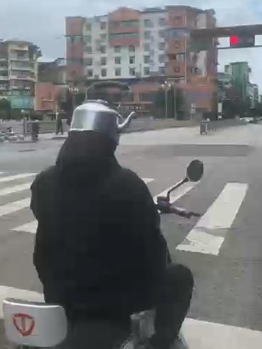 ▲男子戴“烧水壶帽”骑车上路被举报 视频截图