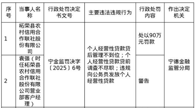 罚单显示,柘荣县农村信用合作联社股份有限公司的主要违法违规事实(案由)为:个人经营性贷款贷后管理不到位;个人经营性贷款贷前调查不尽职;违规向公务员发放个人经营性贷款。
