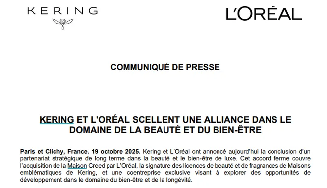 公告披露,L'Oréal收购Kering旗下高端香水品牌Creed,并获得Gucci、Bottega Veneta、Balenciaga三大Kering标志性品牌未来50年独家香水与美妆产品开发与分销权,自现有Coty授权到期后生效。(Gucci美妆授权暂由Coty集团持有,2028年到期后转交欧莱雅。)