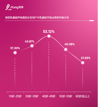 随着年龄的增长,乳腺结节的检出率呈现先升后降趋势。其中,上有老下有小的40岁-49岁女性,成为检出率最高的年龄段,高达53.12%,可能与这一年龄阶段女性体内激素水平的显著波动有关。