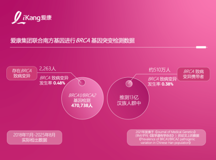 对部分女性而言,乳腺癌发病风险早已写入基因。研究发现,携带BRCA1/2基因突变的女性更易受到乳腺癌"攻击"。而通过BRCA1/2基因检测可以提前直面"天命",提前评估自身风险并及早干预。2018年11月至2025年8月,共计有470,738位爱康用户进行了BRCA1/BRCA2基因检测,其中有2,263位用户的BRCA1/BRCA2基因存在致病变异,致病变异率为0.48%。这与上海交通大学医学院附属第一人民医院、中国科学院植物生理生态研究所、爱康集团和南方基因在2021年发表于《Journal of Medical Genetics》的论文中的数据(女性和男性)基本一致。