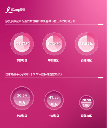 从地域分布看,经济实力和竞争压力一起"遥遥领先"的东部地区乳腺结节检出率最高,达43.73%。中部地区为39.24%,西部地区最低(35.85%),这一趋势与国家癌症中心统计的乳腺癌发病率在地理分区分布上呈正相关。