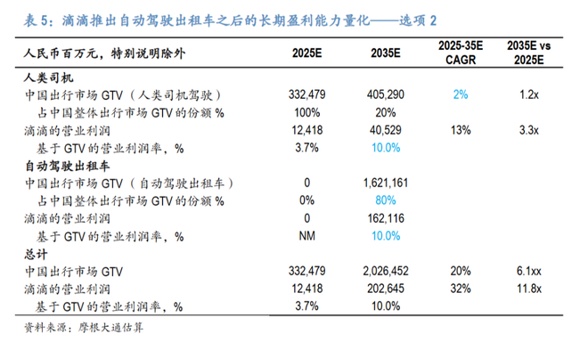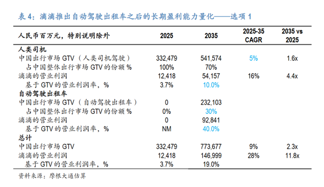 第一种是优先提升盈利能力,即将大部分节约的成本保留在公司内部。报告估算,在此情景下,滴滴的GTV利润率可大幅提升,但市场只能实现约9%的年均复合增长,到2035年其中国出行GTV约为7737亿元。