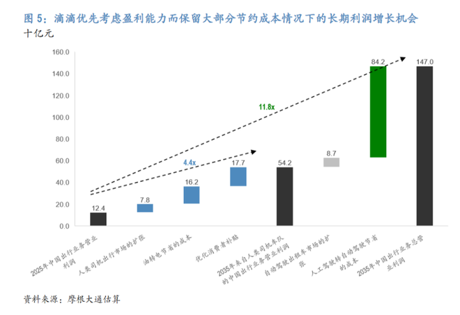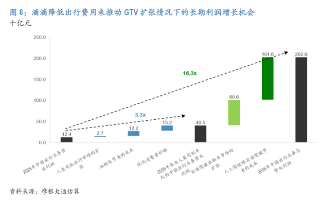 这将创造一个强大的“飞轮效应”:价格下降驱动需求上升,从而改善车辆匹配效率和利用率,进而支持更密集的供应网络,最终结构性地降低服务成本。在此路径下,滴滴的中国出行GTV有望在2035年达到约2.03万亿元人民币。尽管单均利润率较低,但总量的巨大增长将带来更为可观的绝对利润。