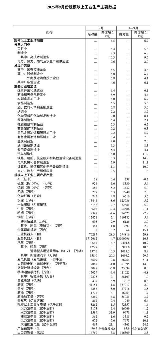 分三大门类看,9月份,采矿业增加值同比增长6.4%,制造业增长7.3%,电力、热力、燃气及水生产和供应业增长0.6%。