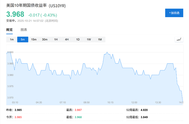 这一预测为近期美国国债的涨势增添了更多动力。受美联储降息预期及美国地区性银行风险担忧的提振,国债市场本已出现一轮反弹。周二,10年期美债收益率徘徊在3.96%左右,本月累计跌幅已达约17个基点。