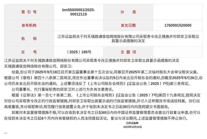 该决定指出,无锡路通视信于2025年9月18日召开第五届董事会第十五次会议,同意召开2025年第二次临时股东大会审议相关议案。根据公司《章程》规定应在作出董事会决议后的5日内发出召开股东会的通知,但截至2025年9月26日公司仍未发出通知。上述事项违反了《上市公司股东会规则》相关规定。公司董事长、代行董秘职责的邱京卫对上述行为负有主要责任。