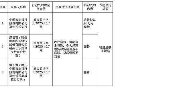 蓝鲸新闻10月21日讯,近日,国家金融监督管理总局福建监管分局发布了罚单,剑指中国农业银行股份有限公司福州长乐支行及其相关责任人。