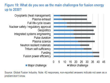 不过摩根大通对此表示质疑,认为真正的商业化应用还需要更长的时间才能实现。在技术挑战方面,大多数受访者指出了诸如核聚变能的效率、资金支持以及氚的自我供应能力等问题。