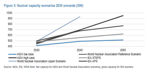 报告指出,美国已将其2050年的核电装机容量目标提升至400吉瓦,这预示着未来可能需要高达约6000亿美元的投资。