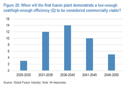 在对44位受访者进行的调查中,大多数人认为,首座能够实现足够高效率、从而具备商业可行性的核聚变反应堆有望在2036年至2040年间投入运行。