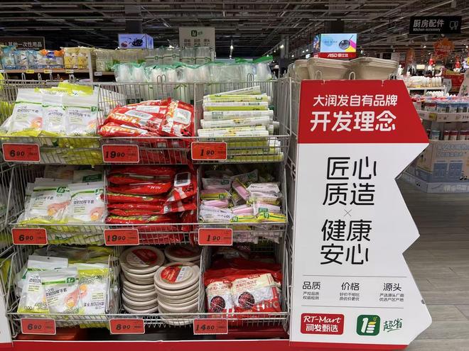10月21日,在大润发上海门店,蓝鲸记者注意到,润发甄选系列摆在商场显眼处、配有明确标识,手撕式保鲜膜1.9元、一次性保鲜膜罩4.9元、手撕猪肉铺每袋11.8元,高鑫零售表示,多款爆款直接对标电商底价。