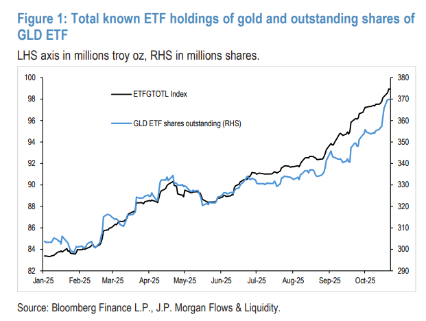 分析认为,此次下跌更可能是由商品交易顾问(CTAs)等动量交易员在金价期货头寸处于极端高位后获利了结所致。而关键观察点是,散户投资者持有的实物黄金ETF在10月21日当天并未出现明显资金外流,显示其长期持有的信心依然稳固。