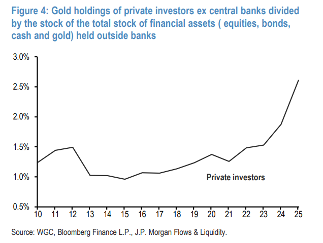 摩根大通的分析师提出了一个关键问题:在全球非银行投资者股票配置高达48%的背景下,2.6%的黄金配置是否足以提供有效对冲?报告认为“可能不够”。