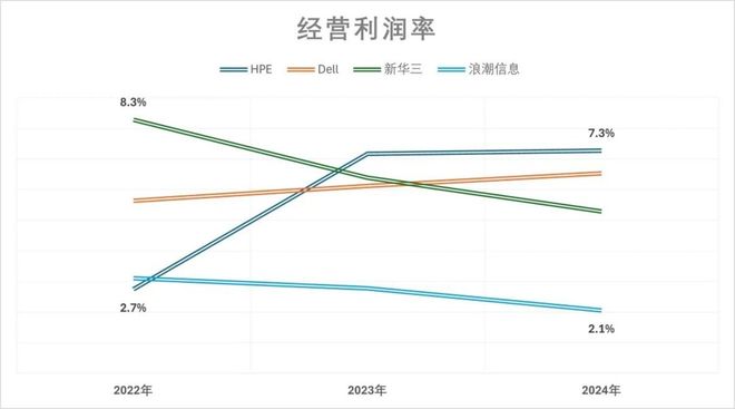 虽然AI行业景气度的提升也推动这些服务器厂商的营业收入大幅提升,但却并未带动其利润水平显著增长,以Dell、HPE、浪潮信息、新华三等为首的主流服务器厂商的经营利润率长期徘徊在10%以下。