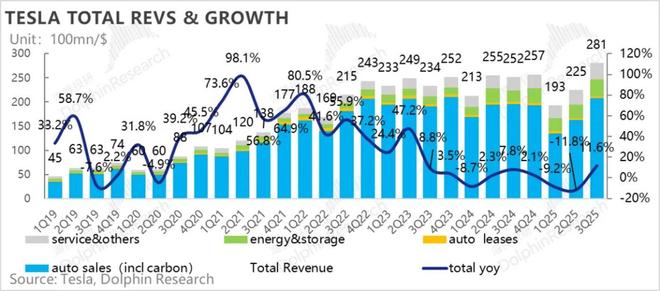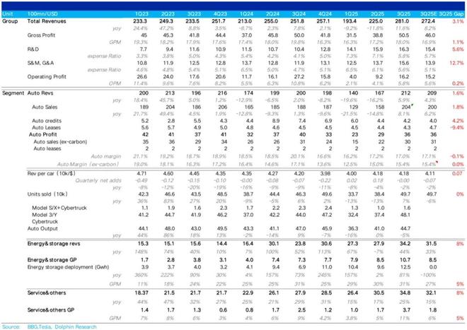1、总收入端表现不错:本季度总收入端 281 亿,实际表现要高于 272 亿的市场预期,储能和服务业务收入都在环比上行,而在最核心的卖车收入上,汽车业务基本盘继续回暖,卖车收入由于卖车单价环比维稳,也是略超市场预期的状态。