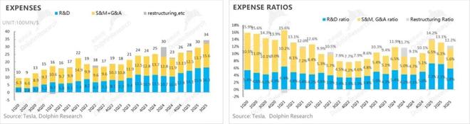 4、研发费用 + 资本开支的狂投都仍然在为 AI 的星辰大海业务买单:特斯拉本季度研发开支和销售费用又在继续加大,研发费用 16.3 亿,高于市场预期 15.4 亿,仍然由于 AI 智能化投入的继续加大,特斯拉向从事 AI 计划的员工授予了股权激励,以及研发费用主要用于 HW5.0 芯片,Robotaxi 和 Optimus 的投入,特斯拉也指引研发费用支出在未来将继续增加。