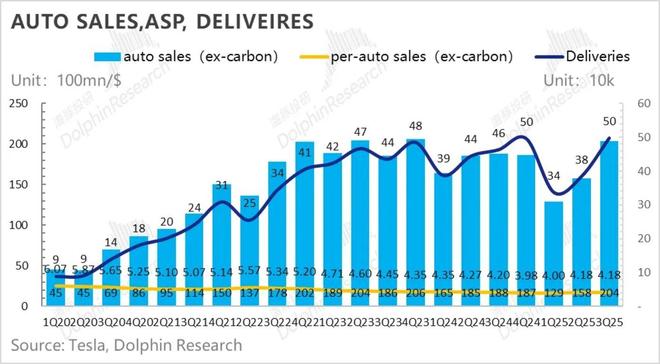 同时由于四季度销量的环比下滑,纯毛利的碳排放积分的继续下滑,以及关税成本对卖车的影响也会在四季度影响继续显现,四季度特斯拉卖车的毛利率预计继续呈现承压趋势。