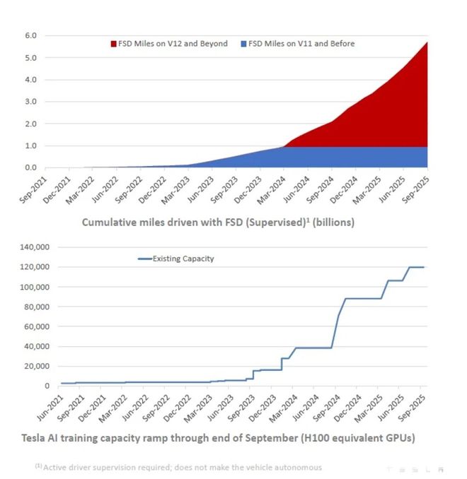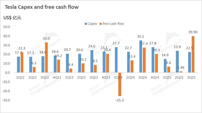 而资本开支本季度虽然环比上季度略有下行,但特斯拉指引今年的资本开支投入将达到 90 亿美元,隐含四季度资本开支 28.7 亿美元,环比本季度 22.5 亿还要在增长 6.2 亿美元,为 FSD 功能的再次大幅迭代,以及 Robotaxi 的商业化扩展做准备,同时 2026 年的资本开支指引还要再大幅增加。