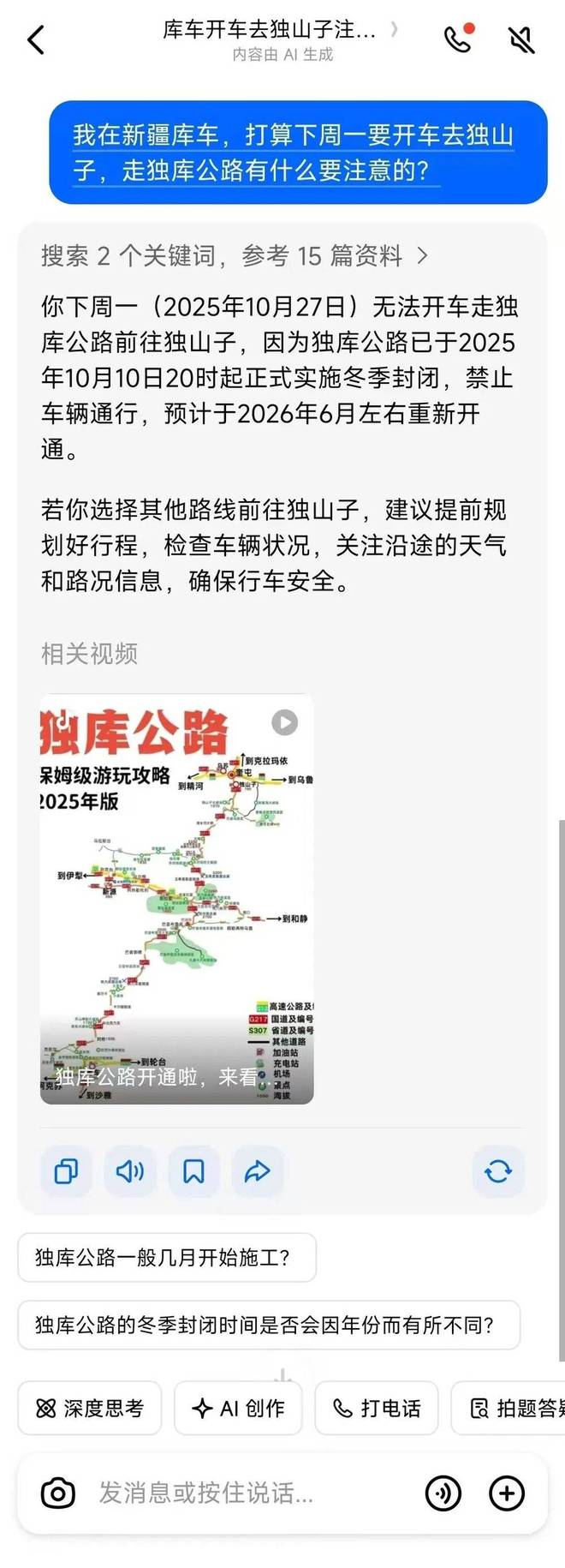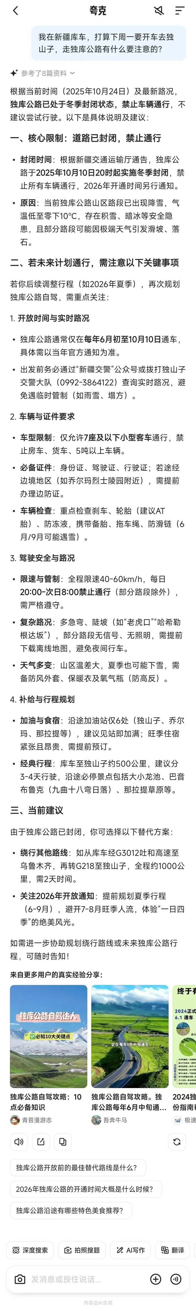 “我在新疆库车,打算下周一要开车去独山子,走独库公路有什么要注意的?”