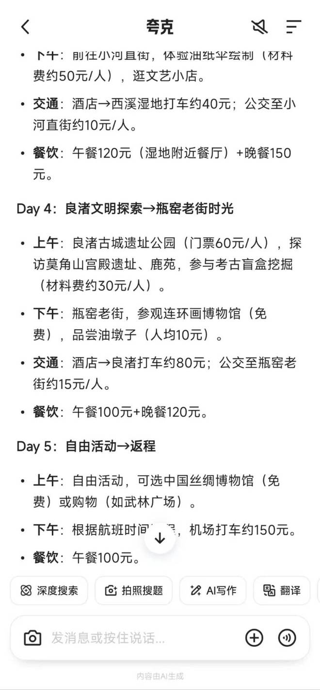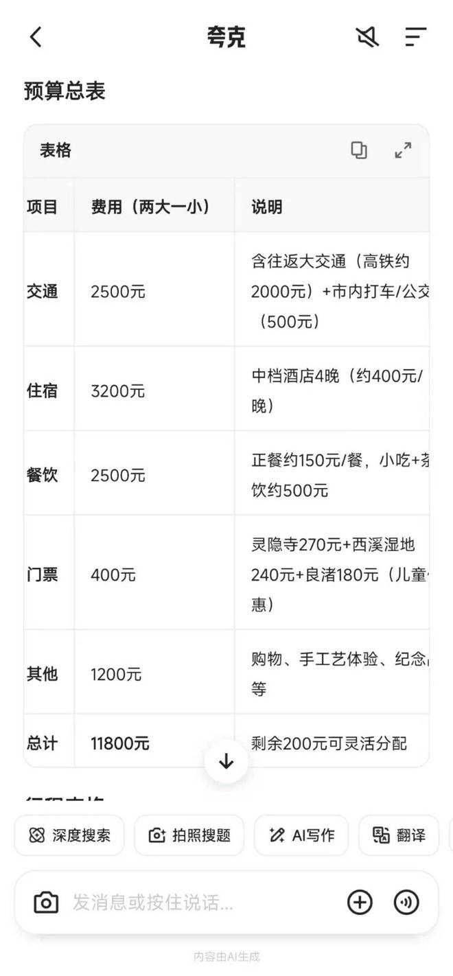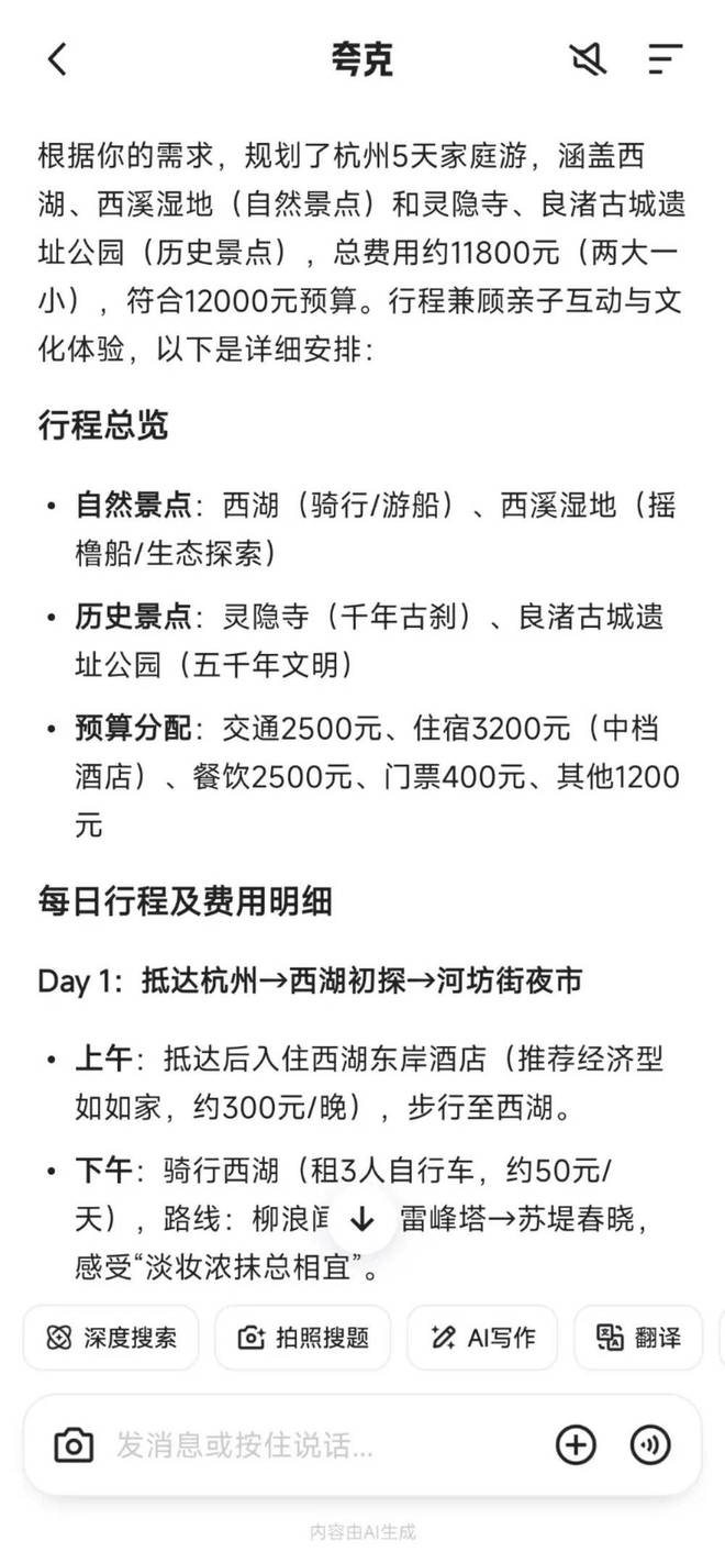 “帮我规划一个为期5天的杭州家庭游,两大一小,要求包含两个自然景点和两个历史景点,预算12000元,并生成一个包含时间、地点、交通预估的表格。”