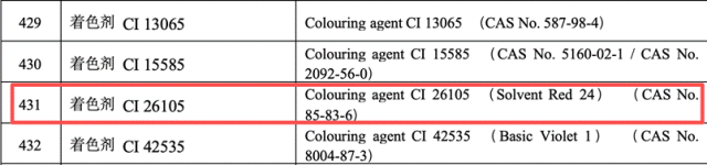 在国家药品监督管理局2021年发布的《化妆品禁用原料目录》里,苏丹红Ⅳ(CI 26105)位于序号431,明确为禁用成分。