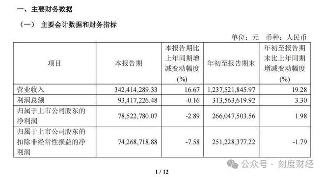 2025年第三季度报告显示,这家企业实现营收3.42亿元,同比增长16.67%,归母净利润0.79亿元,同比下降2.89%,扣非归母净利润0.74亿元,同比下降7.58%。