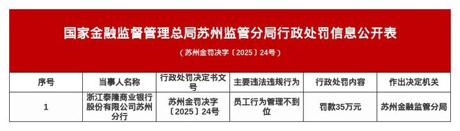 浙江泰隆商业银行苏州分行因员工行为管理不到位被罚款35万