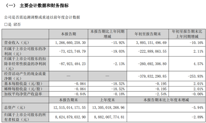 其中,第三季度公司实现营业总收入12.67亿元,同比下降15.92%,归母净利润7342万元,同比减少19.03%。