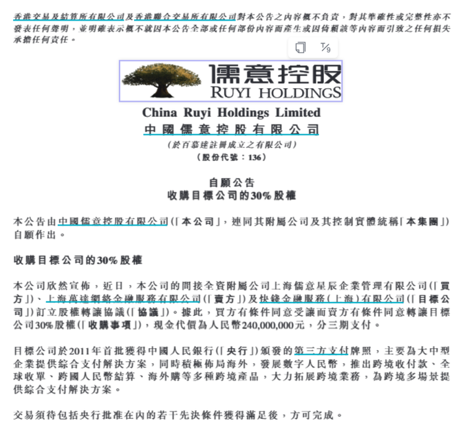 今年7月22日,中国儒意公告,公司间接全资附属公司上海儒意星辰企业管理有限公司(买方)、上海万达网络金融服务有限公司(卖方)及快钱金融服务(上海)有限公司(目标公司,以下简称快钱金融)订立股权转让协议。