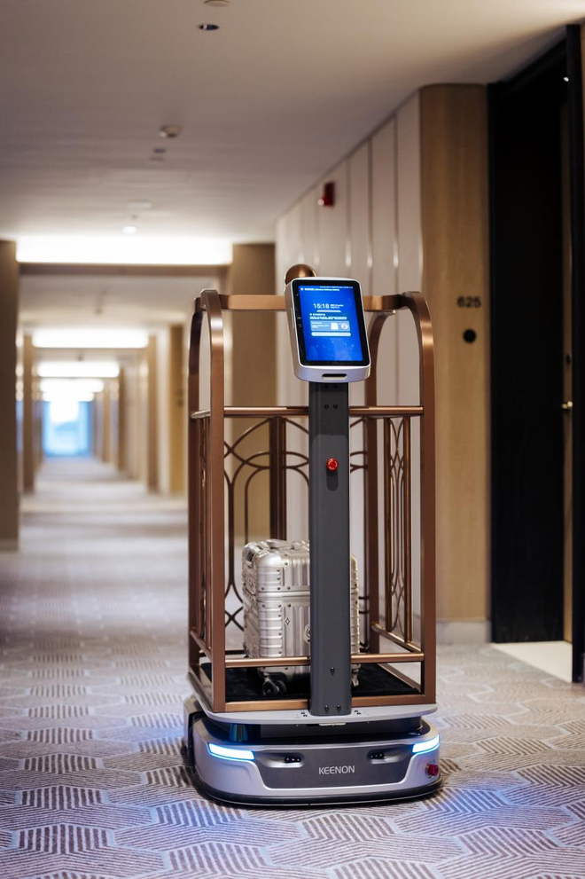 入住第二步,有行李机器人送行李至房间。除了图像定位、立体视觉扫描、激光雷达感应之外,行李机器人还具备安全急停及防撞控制功能,确保稳定运行。此外,这间酒店还配有送餐机器人、清洁机器人、咖啡机器人,为酒店场景增添了很多科技感触点和有趣的互动体验。