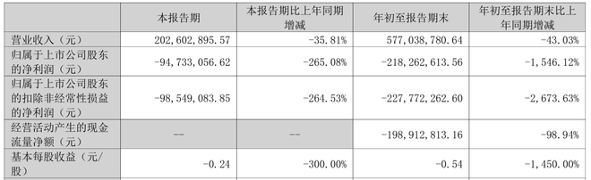 其中第三季度,公司营业收入为2.03亿元,同比下降35.8%;归母净利润自去年同期亏损2595万元变为亏损9473万元,亏损额进一步扩大;扣非归母净利润自去年同期亏损2703万元变为亏损9855万元,亏损额进一步扩大。