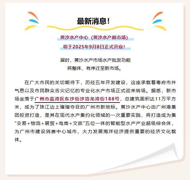 近期,广州港集团官微也发布公告称,本次搬迁主要是迁出水产批发业态。"黄沙水产市场将整体、有序迁出水产批发业态,对现址进行全面升级改造,依托片区优势联动发展,打造集文化产业、文旅零售、文娱体验、餐饮、文旅配套等多功能于一体的广州滨水文旅商业新名片"。