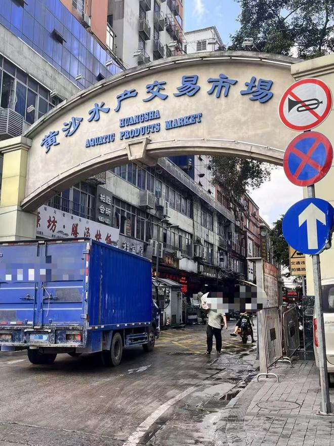 从"黄沙水产交易市场"牌坊进入,街道两边分布着各类型的门店,以及一些售卖水产、海鲜的小店。