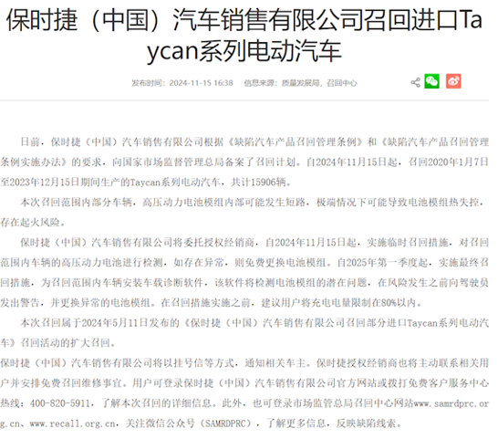 事实上,此前保时捷曾多次发布涉及电池的召回公告。最近一次的召回公告显示,召回范围内的保时捷Taycan高压动力电池模组内部可能发生短路,极端情况下可能导致电池模组热失控,存在起火风险。