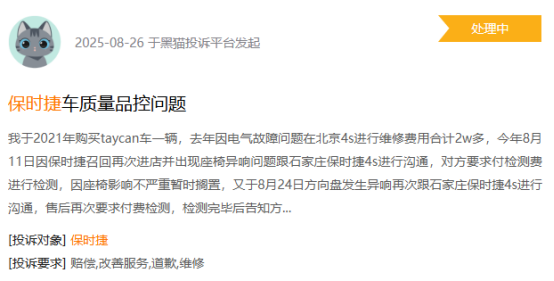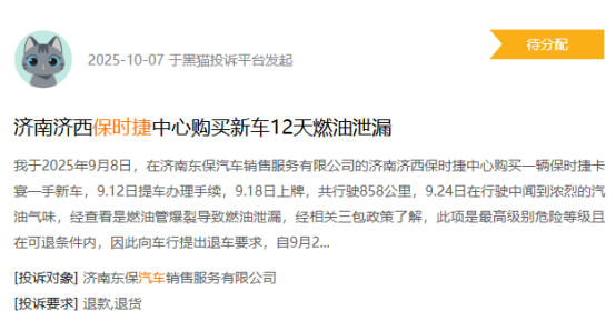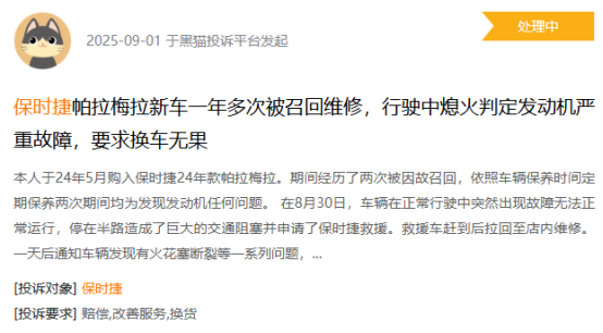 此外,还有不少消费者投诉表示保时捷汽车存在品控问题,例如有车主表示帕拉梅拉新车一年多次被召回维修,行驶中熄火判定发动机严重故障,还有车主投诉称新买的保时捷12天便出现燃油泄漏问题。