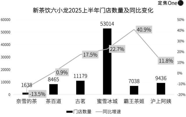 霸王茶姬则在扩张速度上最激进,门店数量达7038家,同比增长40.9%。沪上阿姨(9436家)与茶百道(8465家)保持稳步增长。奈雪则逆势收缩至1638家。