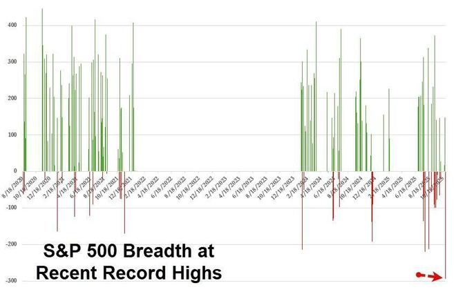 值得注意的是,标普500指数当天以历史新高收盘,但指数内部有398只个股下跌,创下该指数收于历史高位时下跌个股数量的纪录。等权重标普500指数与市值加权指数之间的背离达到历史性水平,凸显市场涨幅集中于少数AI相关巨头的现状。
