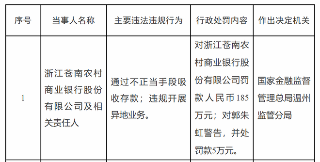 浙江苍南农商行遭罚185万,涉及不正当手段吸收存款等违规行为