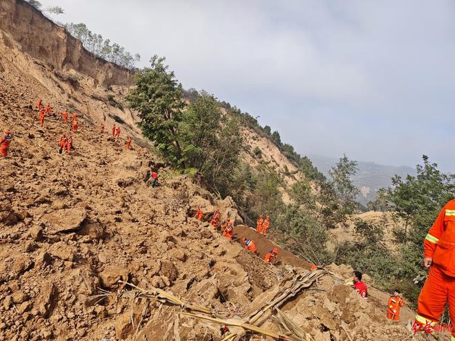 山塬底部有40多位搜救人员正在现场作业,因为滑坡的风险既不能从山塬顶部调大型器械下来参与救援,也因为道路的破坏无法从山的另一面调来设备。为了扩大搜索面积,搜救人员使用铁锹在松软的黄土上挖出了密密麻麻的小坑,每个坑间隔几十厘米的距离。