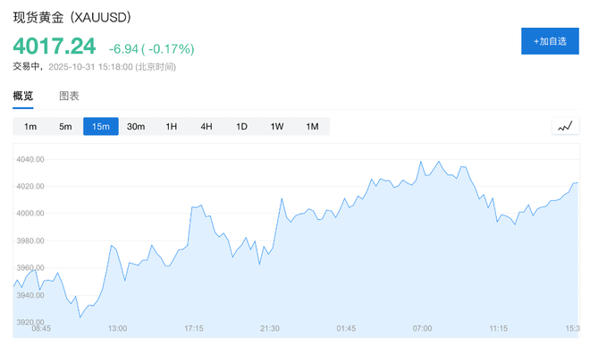 现货黄金下跌0.17%至4017美元/盎司。