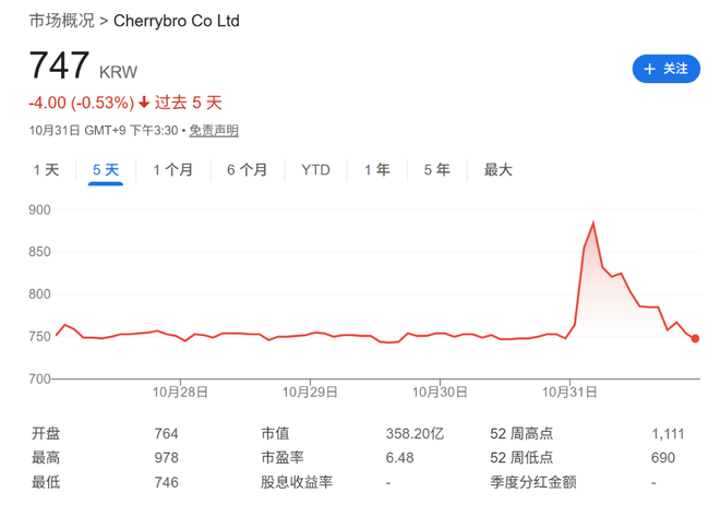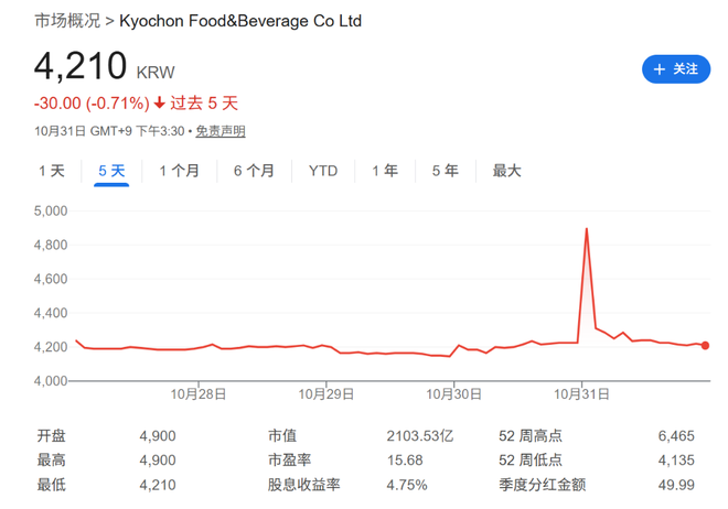由于聚会地点Kkanbu Chicken未上市,寻求短期收益的交易者将目光投向了其他相关公司。炸鸡连锁品牌Kyochon F&B Co.的股价一度上涨20%,而上游的家禽加工商Cherrybro Co.股价更是直接冲高至30%的涨停。