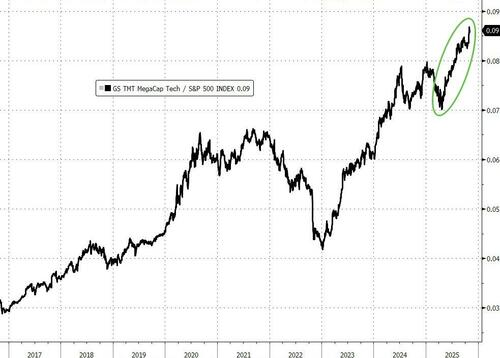 美国七大科技股(Mag-7)大幅跑赢标普500指数其余493只成分股,后者当月基本持平。七巨头相对标普500指数再度突破至显著新高,延续其作为市场核心叙事的地位。