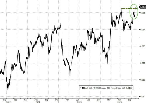 意大利公用事业公司ENEL刚开始响应"AI电力升级"主题,其估值账单加上每股收益动能推动股价触及12个月相对高点。欧洲大型股正开始摆脱年内汇率拖累,空客、ASML和ENEL均创12个月相对新高。