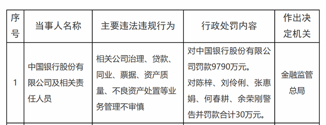 罚单显示,中国银行股份有限公司的主要违法违规行为是:相关公司治理、贷款、同业、票据、资产质量、不良资产处置等业务管理不审慎。