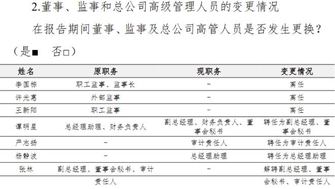 人事变动方面,报告期内公司高管团队出现调整:原总经理助理、财务负责人谭明星被聘任为副总经理、董事会秘书,兼任财务负责人;严志扬被聘任为审计责任人;杨静波被聘任为总经理助理;张林则离任副总经理、董事会秘书、审计责任人职务。